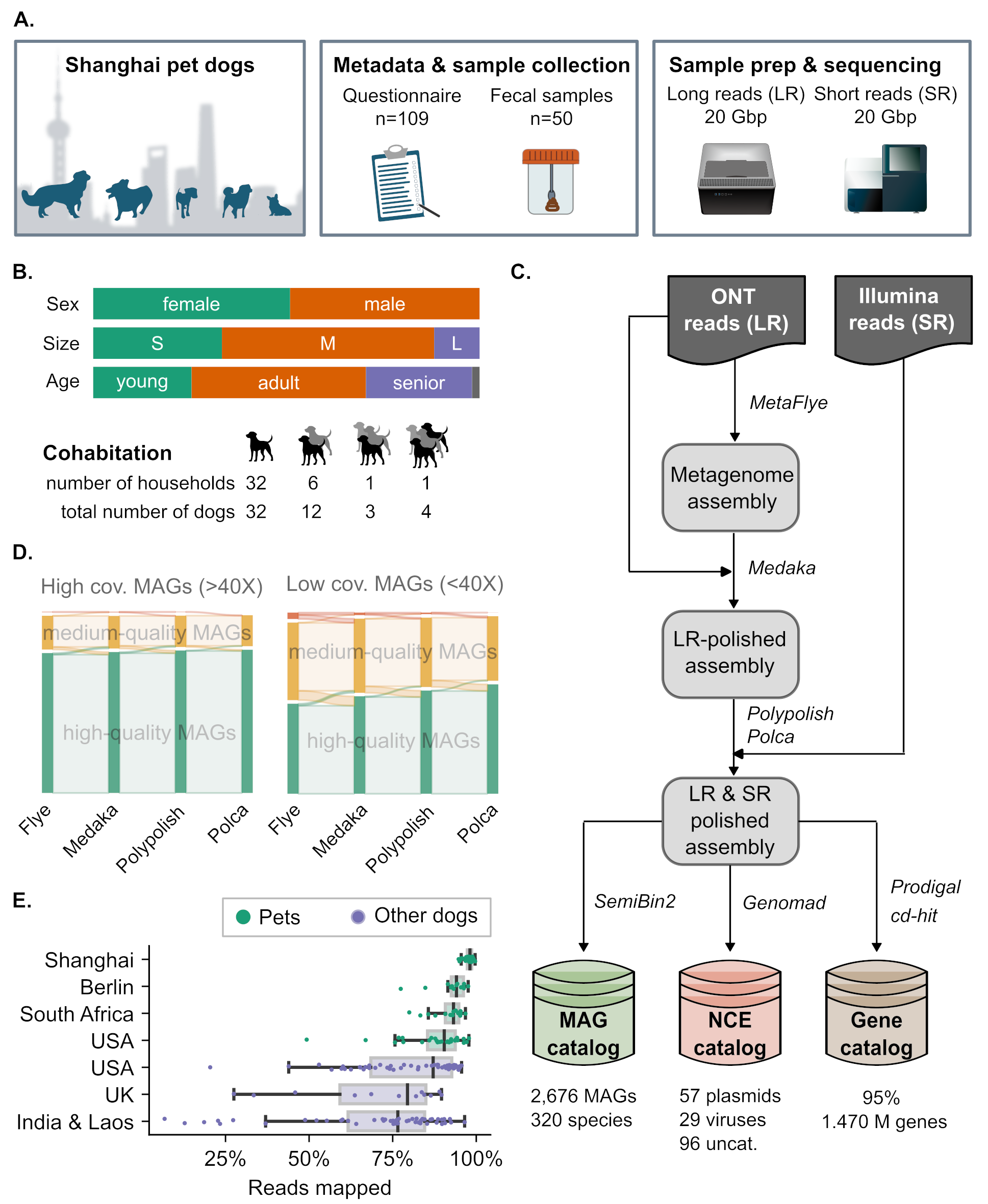 We collected 51 fecal samples from Shanghai pet dogs and deeply sequenced each of them —20 Gbp of short-read and at least 20 Gbp of long-read data per sample. We also gathered information about the dogs’ environment, lifestyle, and other characteristics through owner questionnaires.